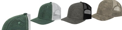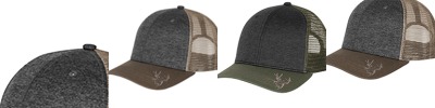 100% polyester heathered knit crown and mesh back; 100% cotton visor with 2" flat embroidery buck head; plastic snapback closure; imported;