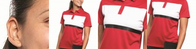 6 oz./yd2 / 210 gsm, 100% polyester pique; ChromaSoft™ technology combines the colorfastness of cationic dyes with soft cotton-feel performance; Moisture-wicking and antimicrobial performance; Feminine Y-neck placket with button detail; Self-fabric collar and integrated collar stays; Dyed-to-match buttons; Side vents; Tear away label;