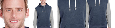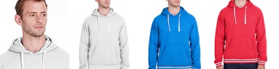 7.5 oz., 55% cotton, 39% polyester, 6% rayon triblend fleece; off white drawcords; 1x1 rib armhole openings and waistband; set-on pouch pocket;
