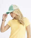 100% cotton mid-weight twill crown & visor; 100% nylon mesh back panels; 100% cotton mid weight twill crown & visor, 100% nylon mesh back panels; 6-panel, unstructured, low-profile; Snap back plastic closure matching back mesh color; Heavy enzyme wash; Self fabric matching color sweatband; Seam tape matches mesh back; Matching color eyelets and pre-curved visor;