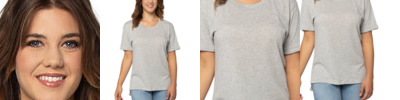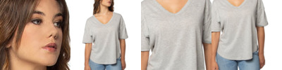 • Features ribbed scoop neck, short rolled sleeves, and a longer back hem for extra coverage