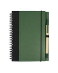 Cover is made of 80% post consumer recycled materials, metal spiral binding is made of 90% post consumer recycled materials, pen barrel is made of 100% post consumer recycled paper