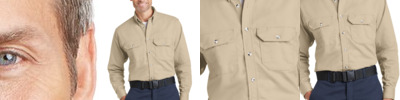 FEATURES Industrial laundry friendly. Banded, topstitched, button-down collar. Placket front with button closure. Tailored sleeve plackets. Topstitched cuffs with button closures.